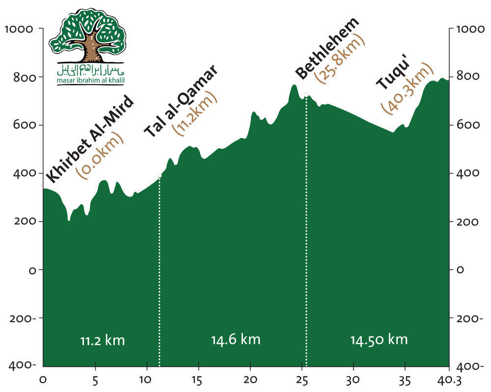 The Masar Ibrahim al-Khalil trail continues through the wilderness between the shrine of An-Nabi Musa and Mar Saba Monastery with scenery full of breathtaking views on remote desert mountains and valleys. Afterwards, the way meanders steeply up the hills towards Bethlehem, the birthplace of Jesus. The town is a natural rest and recovery point for hikers. From there, the path continues to Artas, passing near ancient aqueducts, Solomon’s Pools, and the picturesque convent of Hortus Conclusus. This section ends in the historical village of Tuqu’ with a view on the Herodium (Jabal al-Fourdis), a fortress built by King Herod the Great.