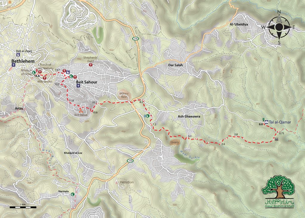 After leaving the Bedouin desert, the Masar will take walkers step by step through rural Palestinian life. Here you will discover the meadows and serene villages. The more urban life awaits in Beit Sahour and Bethlehem, the place of Jesus’ birth. There are many historical and sacred sites to visit such as the Church of the Nativity, the Milk Grotto, and Shepherds Fields.