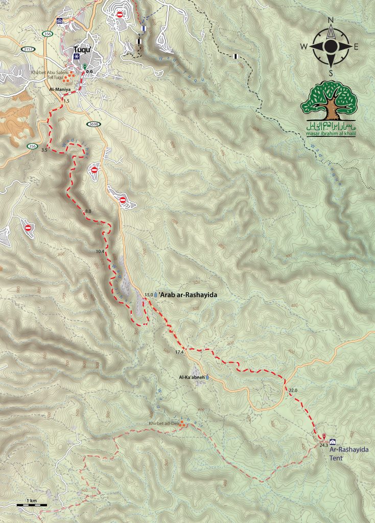 The hike from Tuqu’ to Wadi el-Jihar will take about 4 hours; the terrain is rocky, with a few small climbs. Once you emerge from the valley and come to ‘Arab ar-Rashayida village, you will have the opportunity to try a traditional Palestinian meal at one of the homestays there.