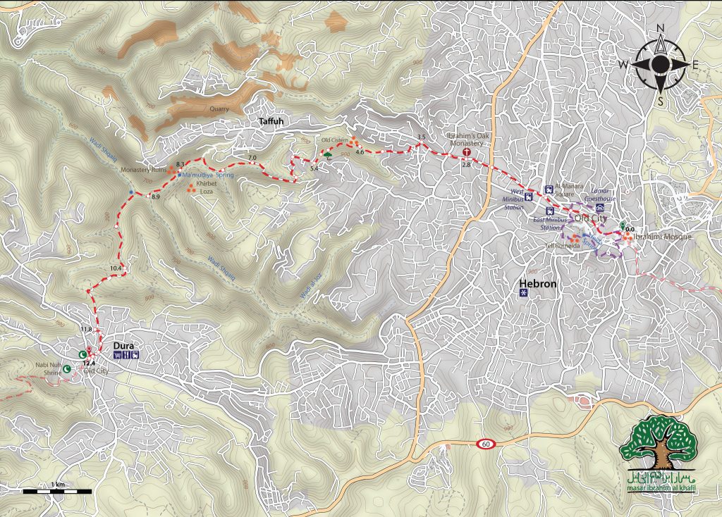 This route takes hikers from the busy streets of Hebron through agricultural fields surrounding the city and picturesque valleys rich in natural beauty and archeological sites.