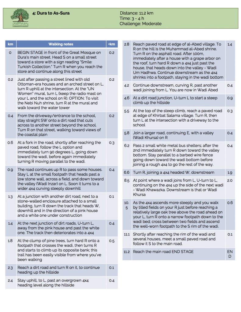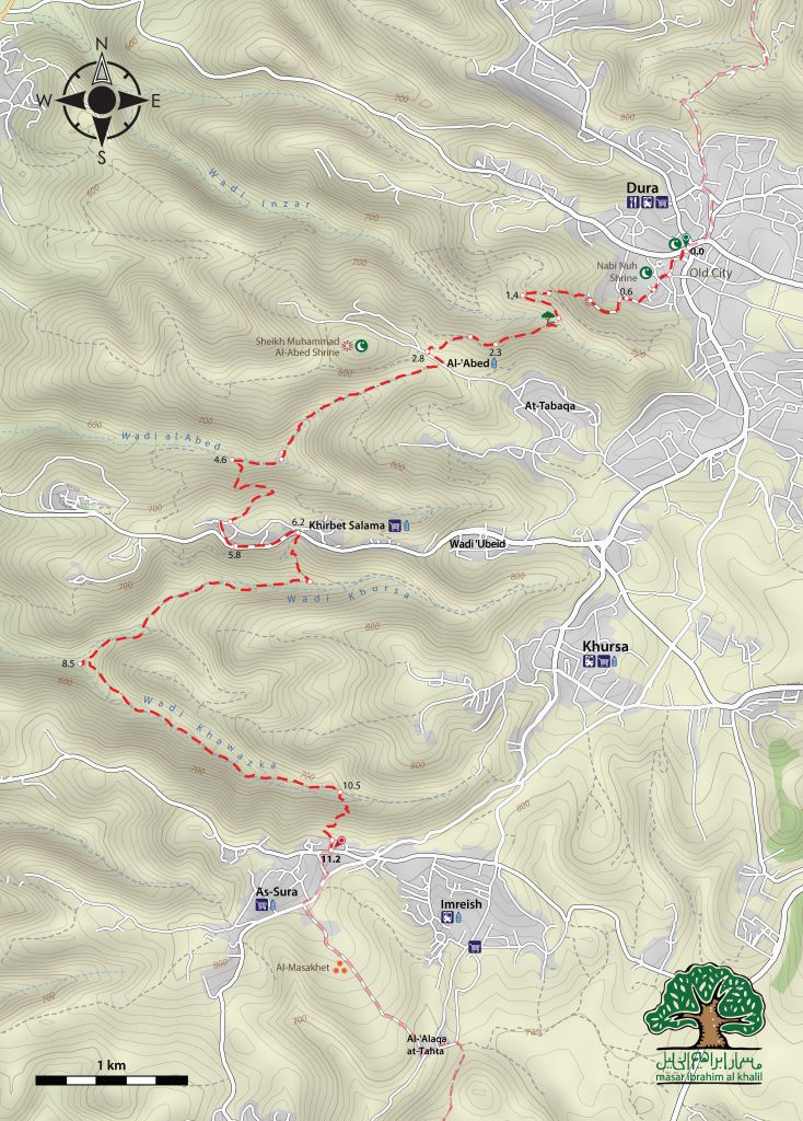 After leaving Dura, the trail passes through scenic valleys covered with the abundant pine trees. Along the way, there are some hills to climb. The final part of this section leads up the hill to As-Sura, a small agricultural village in the Hebron Governorate.