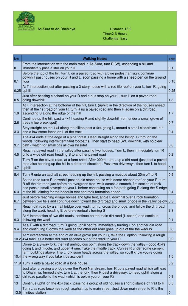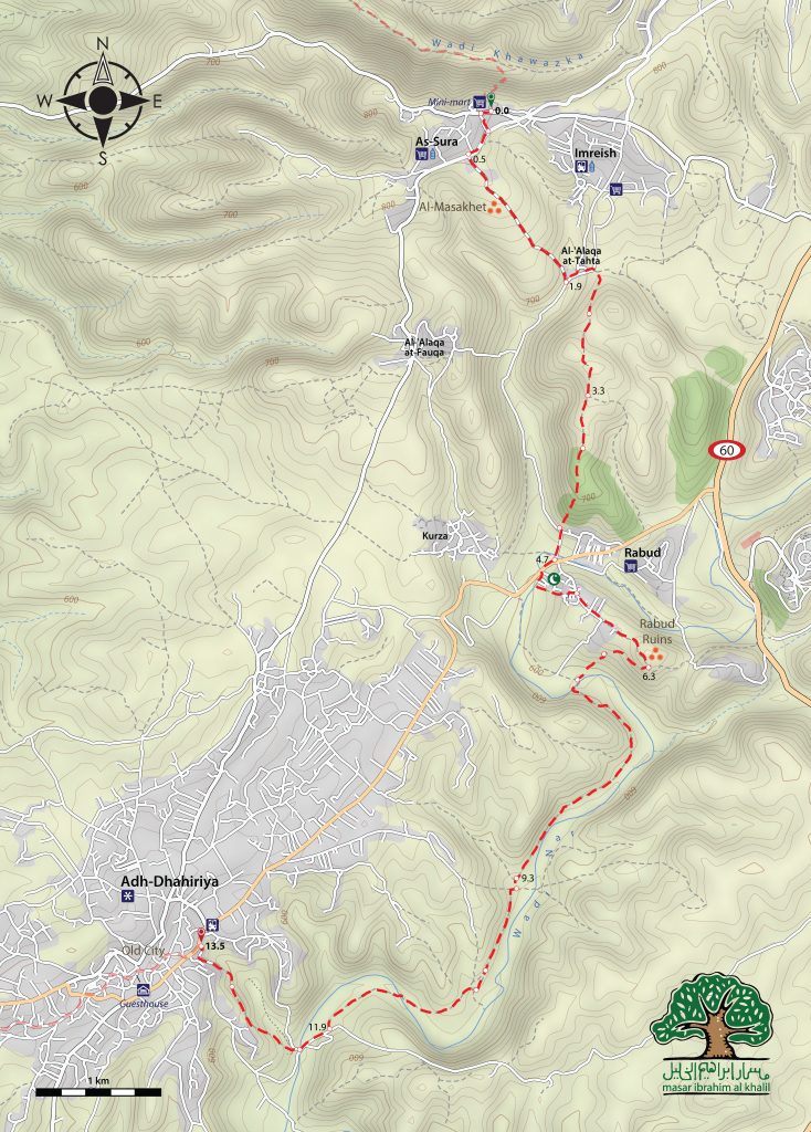 After passing through the rural areas surrounding As-Sura, the path to Adh-Dhahriya, leads through evergreen pine forests. It continues towards Khirbet Rabud, the only major Late Bronze Age archaeological site in the mountains around Hebron. At the end of the 19th century the area was inhabited again. The inhabitants made use of the caves for protection, at first temporary and then permanent residences. However, the Ottoman village of Rabud has been left to decay since 1970’s. Yet the ruins are some of the best preserved examples of vernacular architecture in the mountains around Hebron. The new village of Raboud is built nearby.
