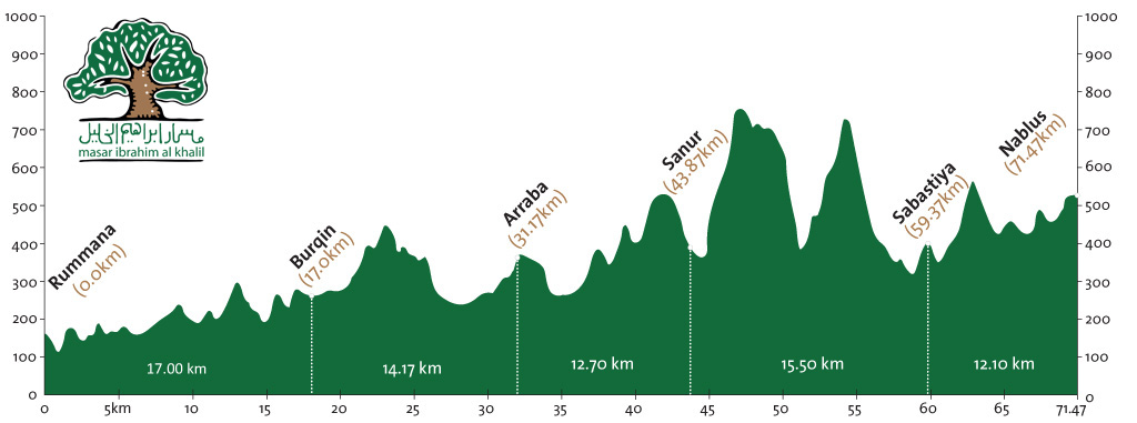 The rural setting of the Jenin Region gives a way to city noise as the trail approaches Nablus, nestled between two looming mountains. The city, famed for products such as olive oil soap and the sweet, cheesy knafeh, is known for its old city that can be explored through a network of labyrinthine streets where one will find old spice mills, Turkish bathhouses, and splendid manors. On the top of neighboring Mt. Gerizim, the Samaritans, a tiny group once nearly extinct, preserve their religion and priesthood on their holy mountain. Across the city of Nablus, between the modern buildings, can be found remains of the once-great Roman city of Neapolis.