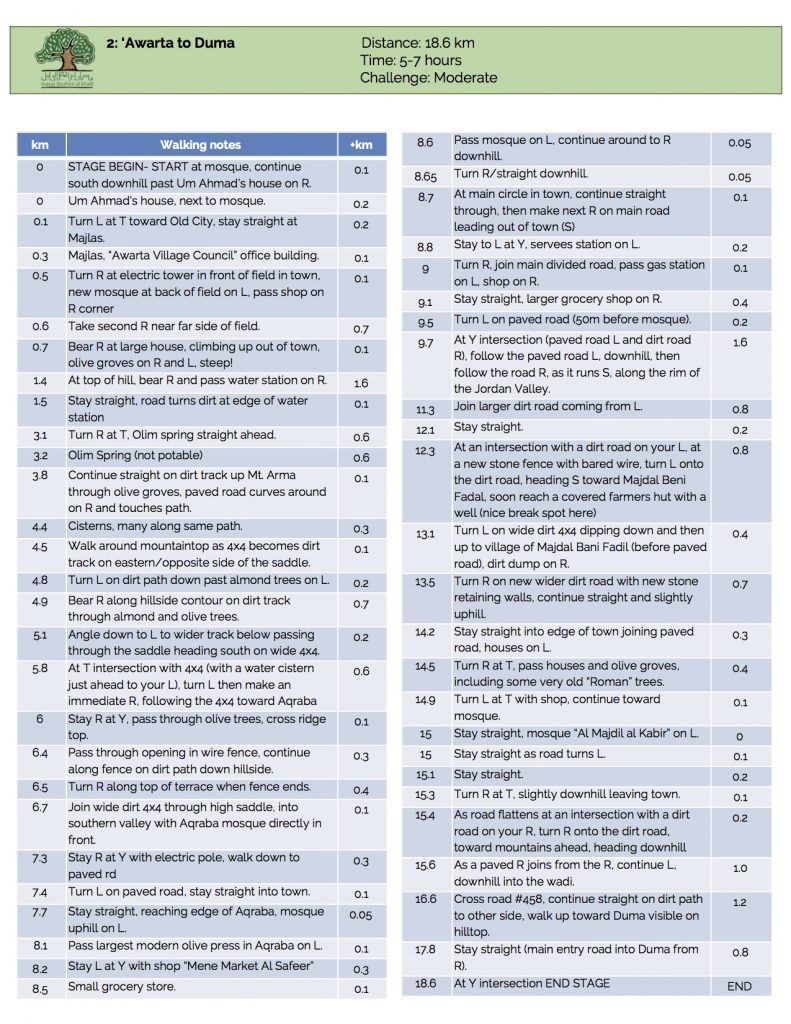A few kilometers ahead, the trail passes through Aqraba, a village whose name (scorpion in Arabic), according to oral tradition, came from Canaanites who compared Aqraba’s inhabitants’ strength to that of scorpions. From Arqaba, the route takes hikers along the rim of the Jordan Valley with incredible views of Jordan and Al-Qarn (or Sartaba), an ancient mountain-top fortress. Continuing through the village of Majdal Bani Fadil, the trail ends in Duma, a Palestinian village whose name comes from the Canaanite word for quietness or rest.